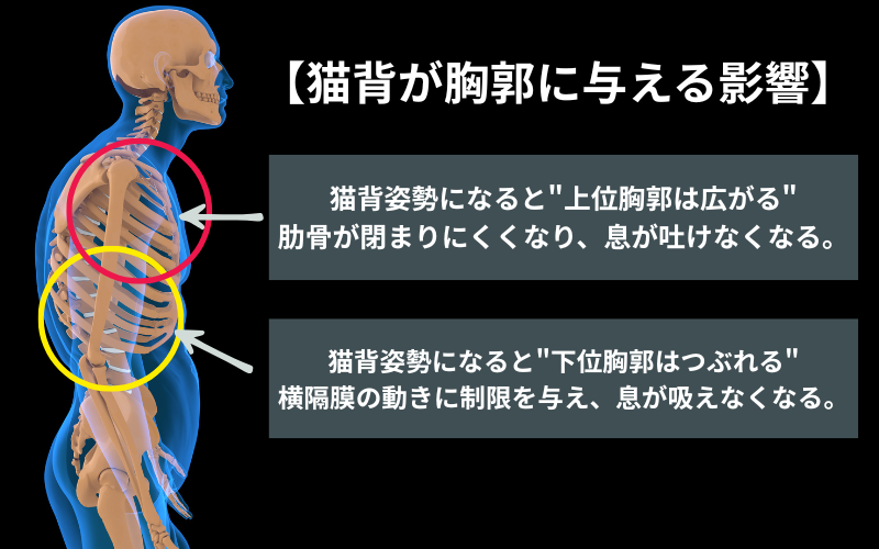 猫背が胸郭に与える影響は甚大です。猫背姿勢になると、上位胸郭は広がったまま固定されるため、息を吐くことが難しくなります。そして、下位胸郭はギュッとつぶれてしまうため、横隔膜の動きが制限されて息を吸うのが難しくなります。
